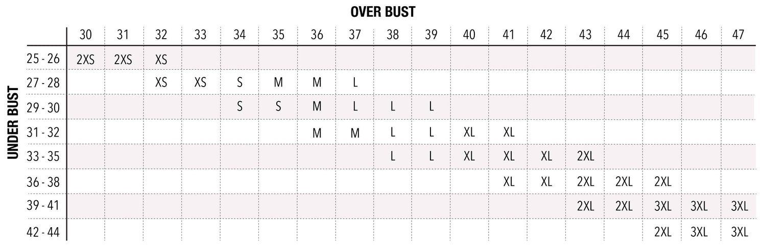 Use the chart below to find your correct bra size based on your band and cup measurements. Remember, this is only a guide.